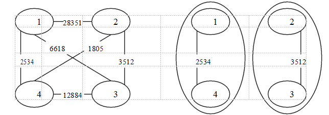 罪犯之间的怨气值如下面左图所示,右图所示为罪犯的分配方法,市长看到的冲突事件影响力是 3512(由 2 号和 3 号罪犯引发)。其他任何分法都不会比这个分法更优。
